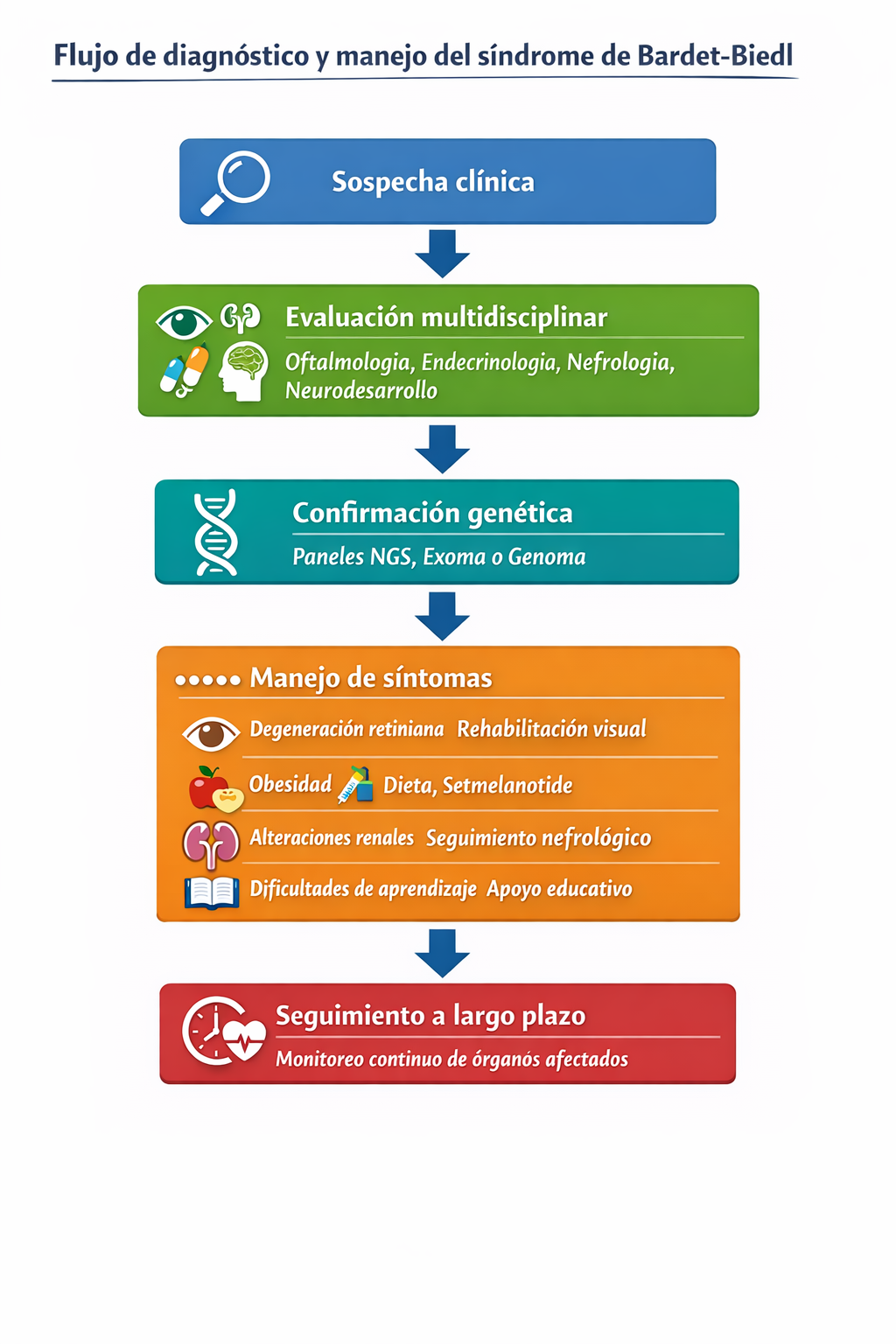 En cuanto al tratamiento, actualmente no existe una cura para el síndrome de Bardet-Biedl, por lo que el manejo se centra en el tratamiento de las diferentes manifestaciones clínicas mediante un enfoque multidisciplinar que incluya oftalmología, endocrinología, nefrología, pediatría y apoyo educativo o neuropsicológico. El seguimiento a lo largo de la vida es fundamental para prevenir complicaciones y mejorar la calidad de vida de los pacientes.